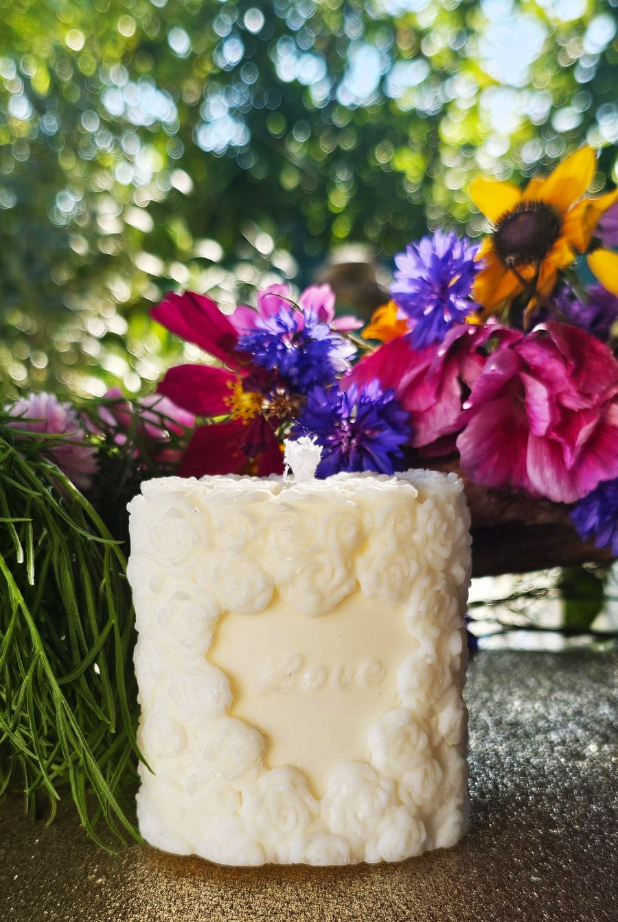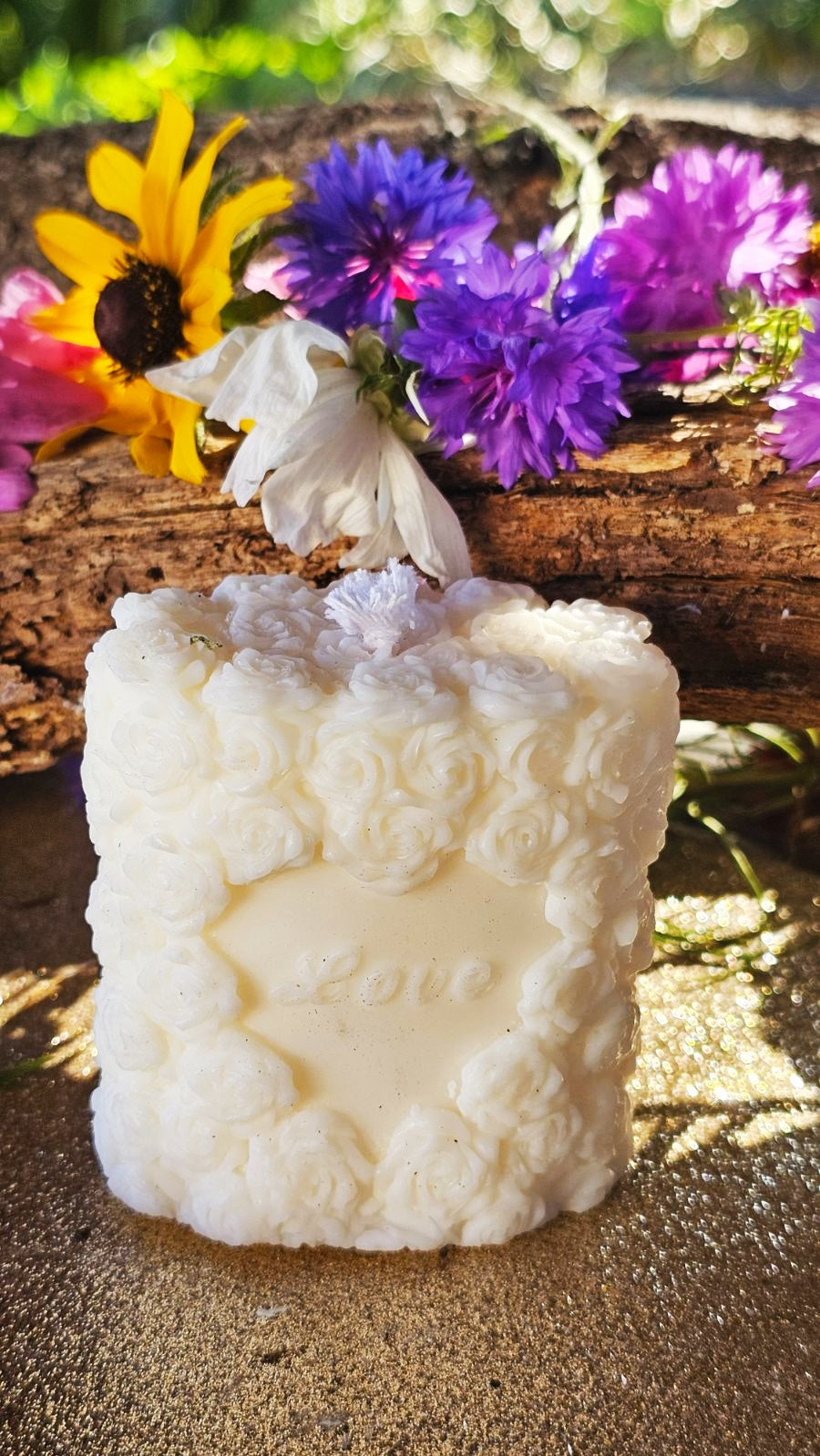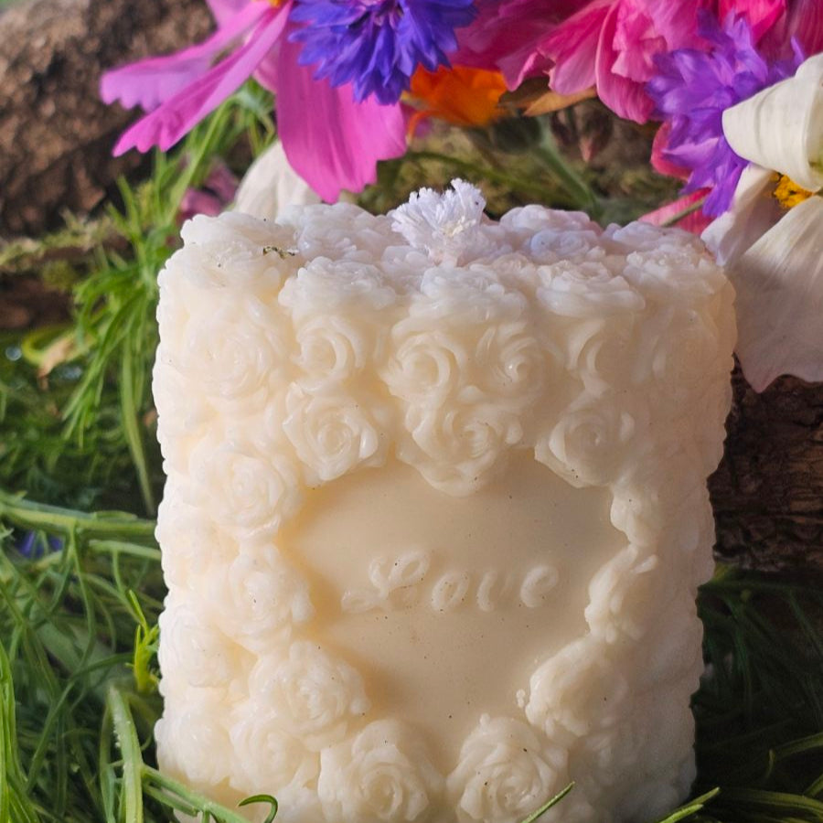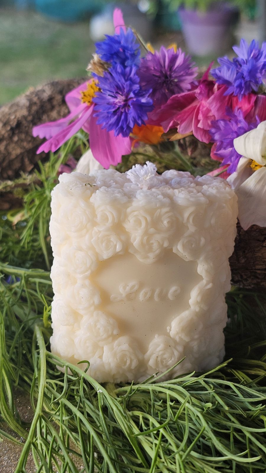 La Bougie Love, d’environ 150 g, est confectionnée en cire de soja naturelle, garantissant une combustion propre et durable.