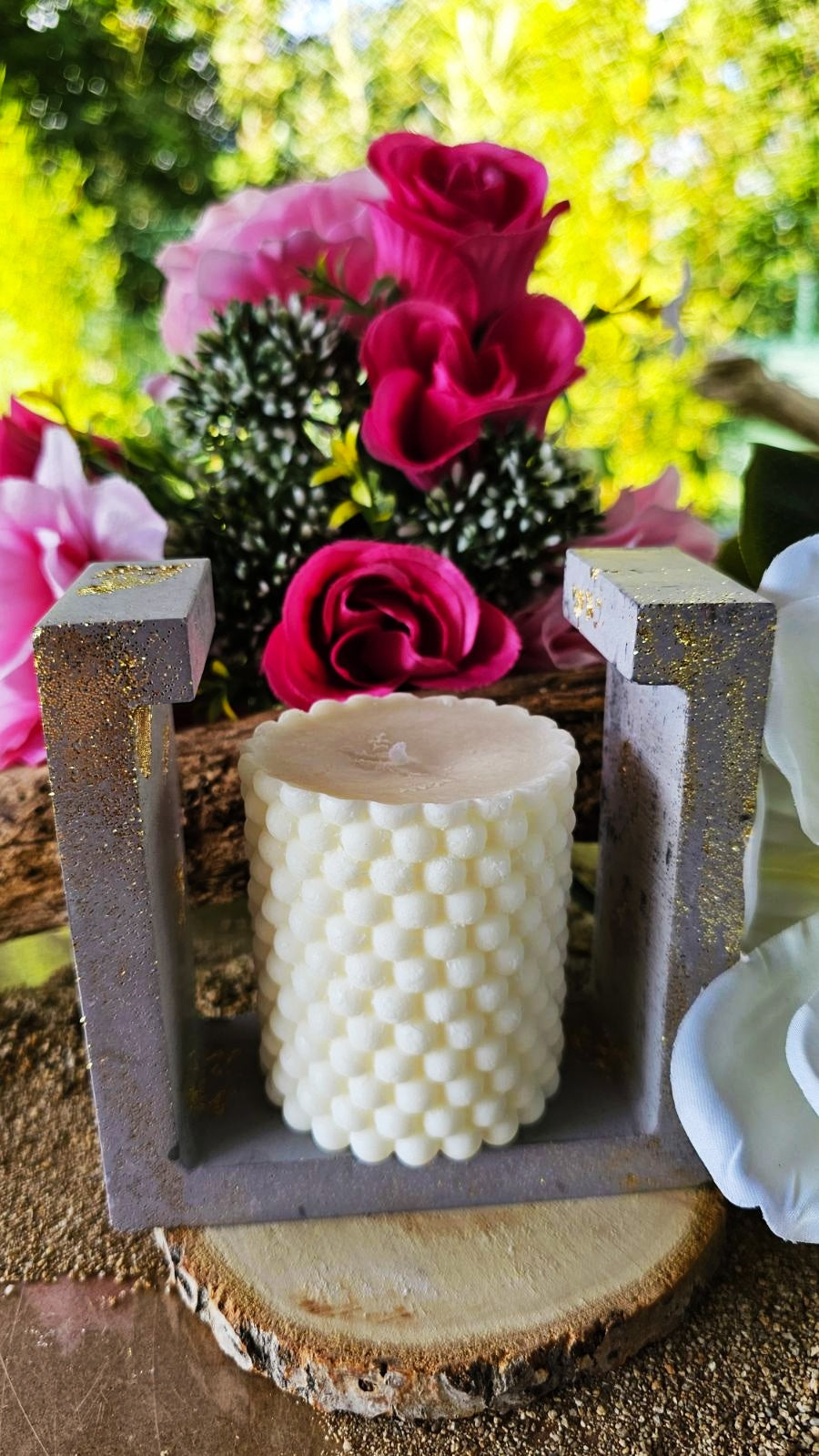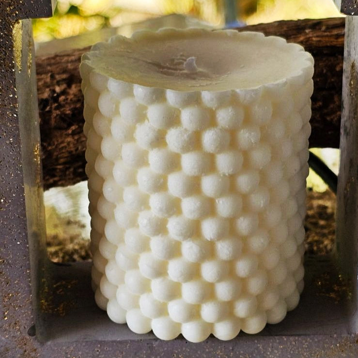 Cette bougie pilier de perles, mesurant 7 cm de hauteur et 6 cm de largeur, pèse environ 170 g.