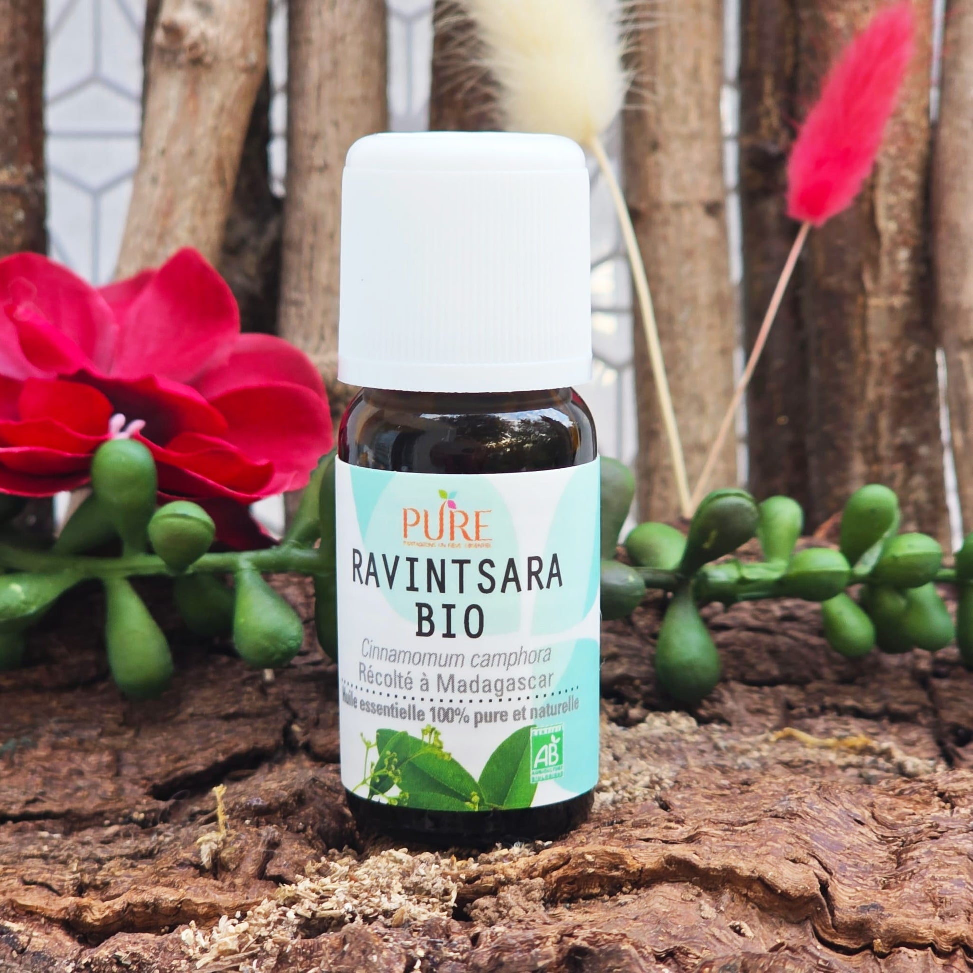 Informations générales : Le ravintsara se traduit littéralement en Malgache par “feuilles bienfaisantes” une dénomination illustrant sa polyvalence est largement confirmée par son usage en aromathérapie. Originaire de Madagascar, cet arbre de la famille du laurier, possède des feuilles vertes foncé, dont est extrait l'huile essentielle. Elle dégage une odeur caractéristique d’eucalyptol.