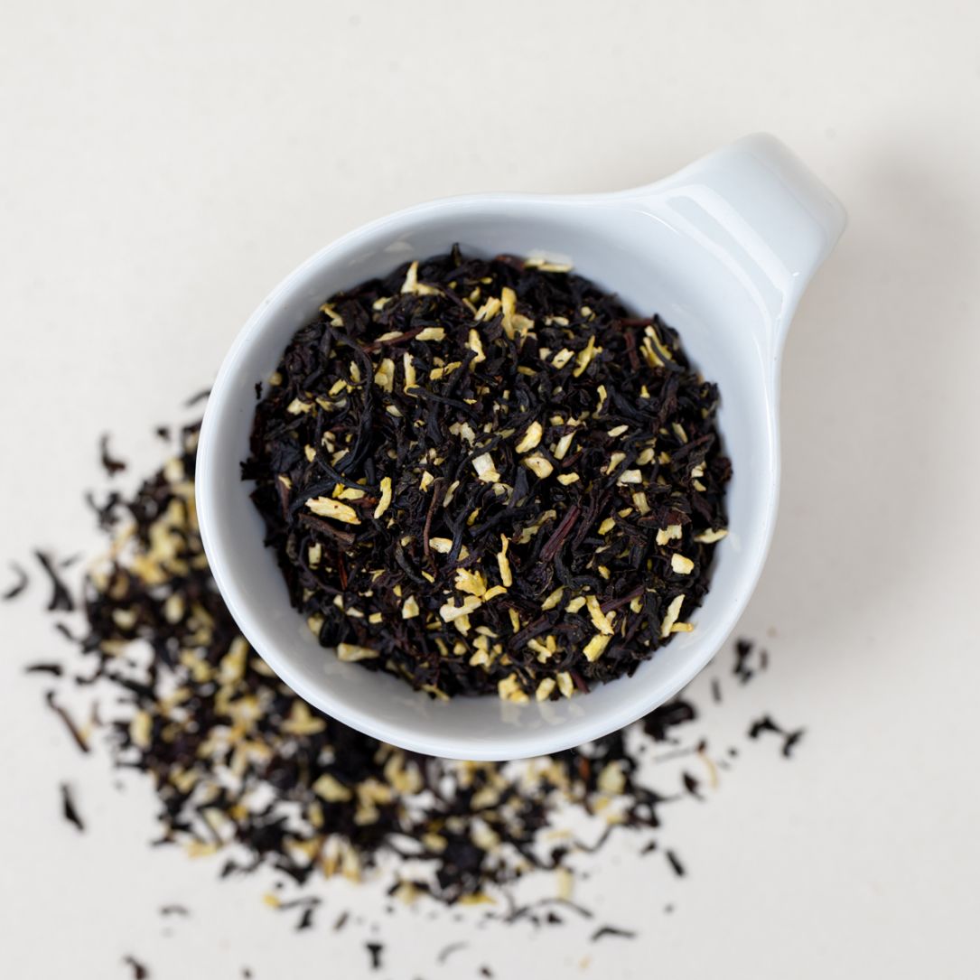 Thé noir Assam, -Inde du Sud, coco (23%), arôme naturel de noix de coco, extrait de vanille.